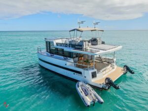 Ce multicoque breveté MULTIKATFLO de 12,81m de long sur 6,87m a une stabilité éprouvée pour le confort de ses hôtes et sa capacité d’emport est 30% supérieure à celle d’un catamaran de même dimension. Ses volumes « parallélépipédiques » offrent une surface de 107m² utiles ! Espace détente intérieur avec vue panoramique sur la nature environnante, belle terrasse à vivre extérieure, longue plage arrière pour la baignade… STAY-Ô est modulable et facile à agencer avec du mobilier standard. Des vides techniques très accessibles facilitent la maintenance. Deux soutes arrière de 3m de long par 1 m 30 de haut permettent d’y placer tous les équipements techniques. Personnalisable, STAY-Ô est proposé en 8 versions d’aménagement, d’une à quatre chambres et avec un large choix de revêtements intérieurs et extérieurs.